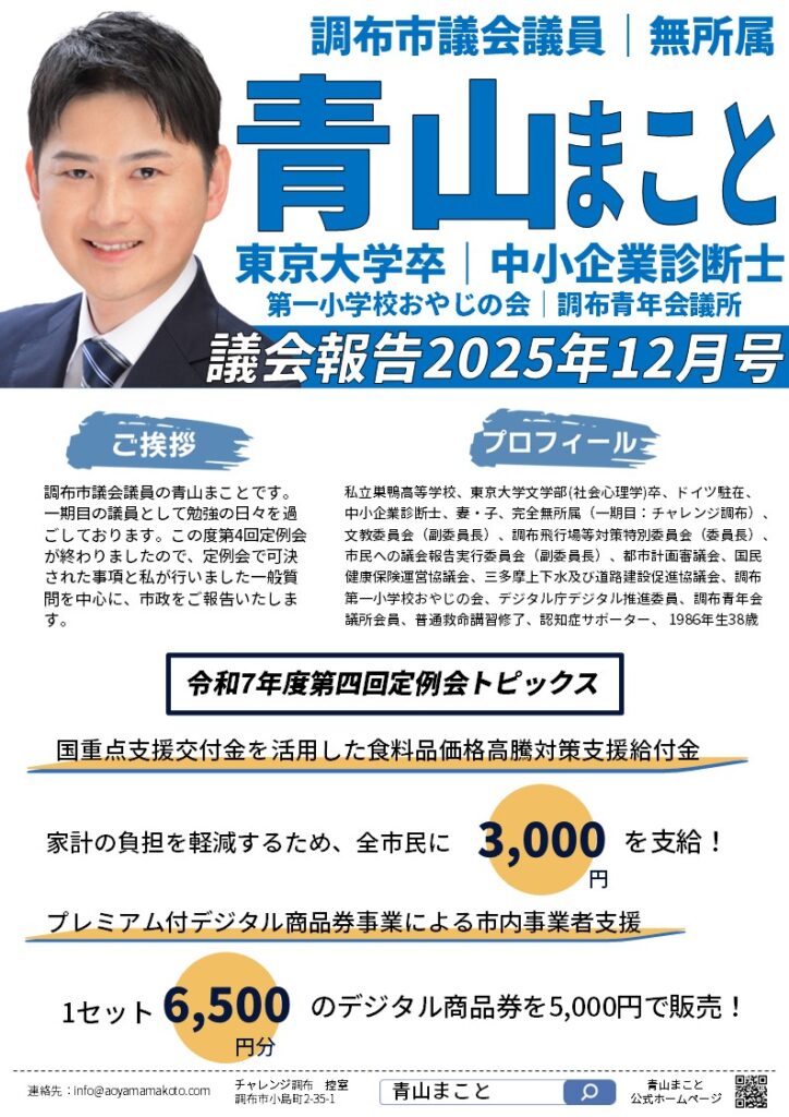 2023年の調布市議会選挙にて2057票を頂き当選。文教委員会(副委員長)、調布飛行場等対策特別委員会(委員長)、市民への議会報告実行委員会(副委員長)、都市計画審議会、国民健康保険運営協議会、三多摩上下水及び道路建設促進協議会にて活動(現議会において最多タイの役職数)。
