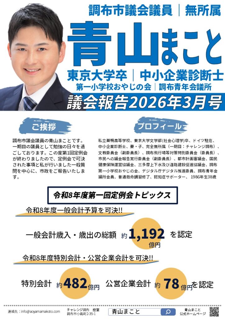- 議会報告2026年3月号を作成しました本定例会のトピックとして令和8年度予算(一般会計・特別会計・公営会計)に加え、調布の環境(脱炭素・リユース)・市役所DX・幼稚園支援に関する一般質問についてまとめています。 ぜひとも下記URLからpdf版もご覧いただけま […]