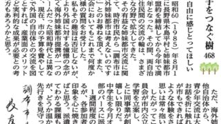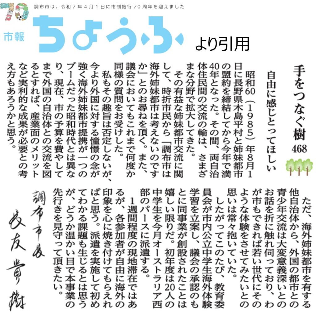 そして届いた市報ちょうふを見ると、市長のコラムにて調布市中学生海外体験学習事業について触れられています。市長にも確認しましたが、2年前に行った建設的な提案が実を結んだとのことで、今後とも地道に提案していきたいと思いました。