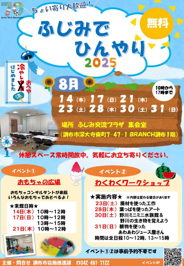 そのような中、BRANCH調布来館者や周辺住民のみなさまが、涼しい環境で過ごせるように、ふじみ交流プラザの集会室を開放するとのことで、共有いたします。