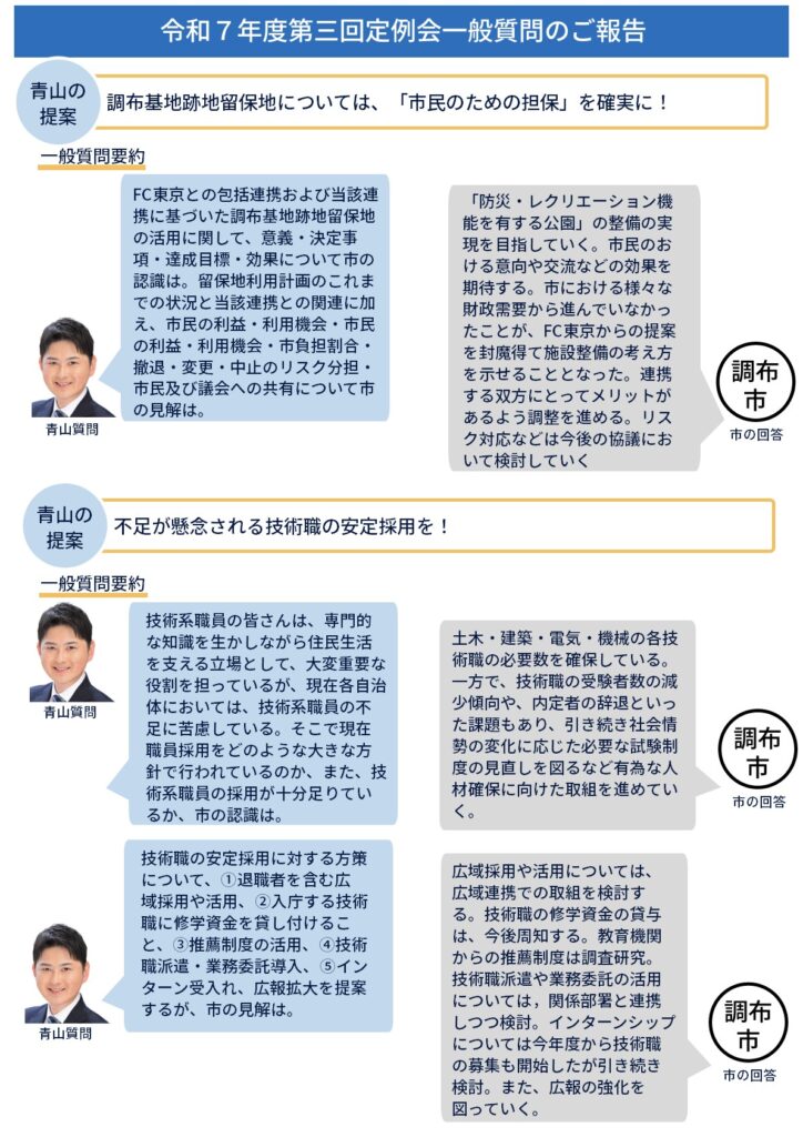 本定例会のトピックであった決算認定や、補正予算、FC東京との基地跡地留保地や技術職の安定採用に関する一般質問についてまとめています。