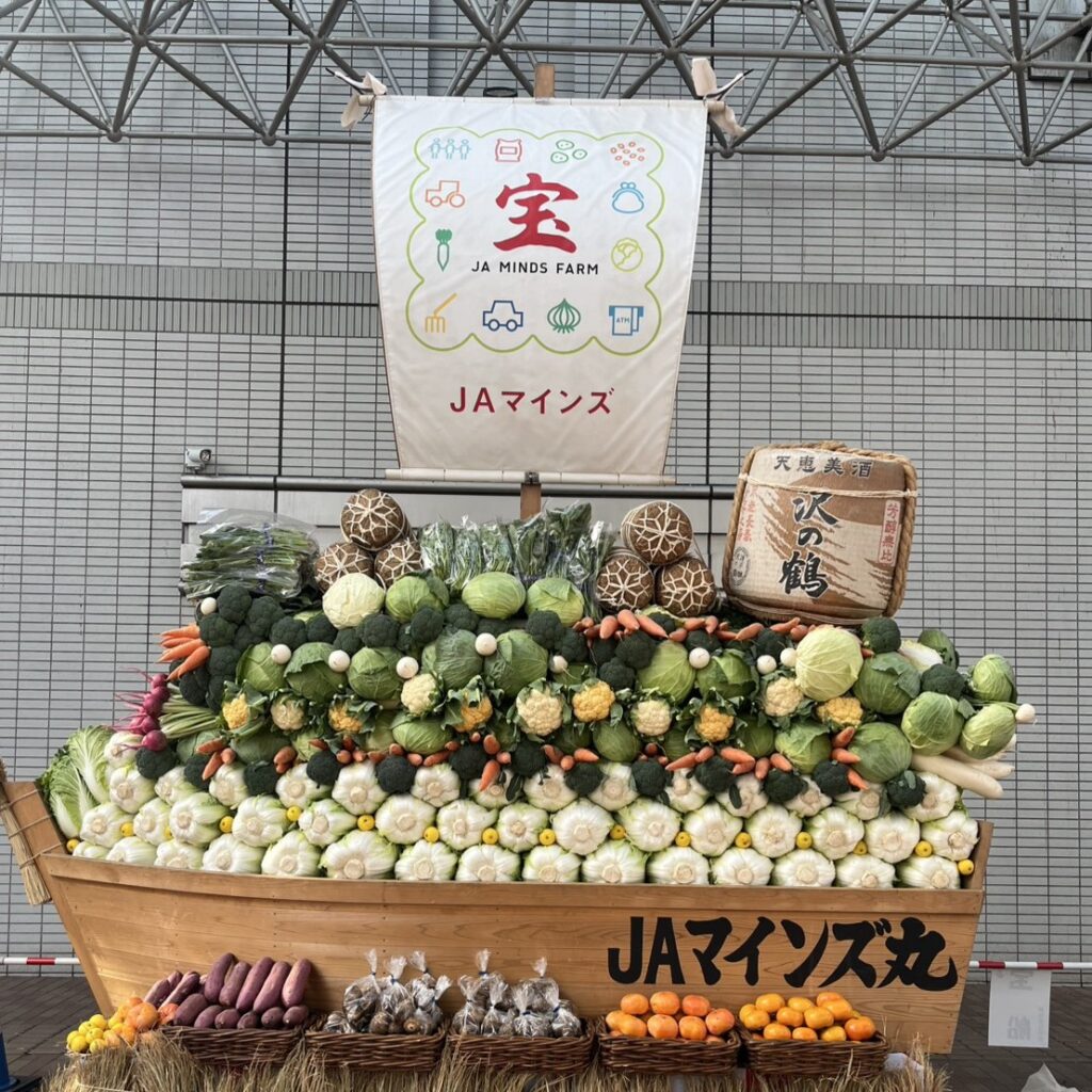 姉妹都市である木島平村農産物即売には人だかりができているとともに、きれいな宝船もできていました。