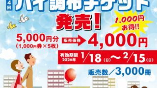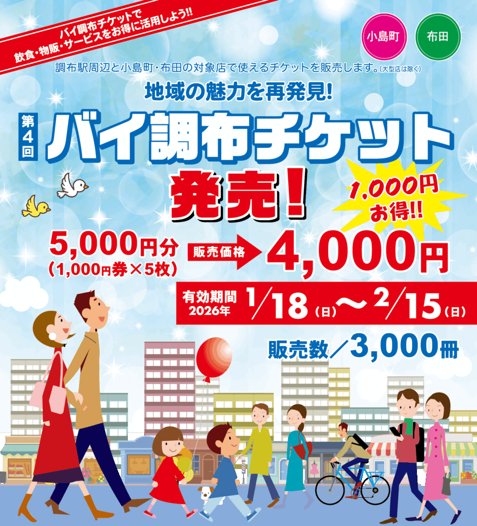 調布市商工会では2026年1月18日〜2月15日までの期間に、【調布駅周辺と小島町・布田周辺】で利用できるバイ調布チケットの応募が始まっています。