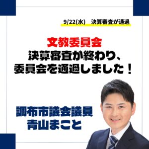 本定例会の一番大きなトピックスである令和6年度調布市一般会計歳入歳出決算の認定について、文教委員会所管分は4日間かけて審査されました。 私のほうでは、中小企業診断士として専門性を持った産業振興分野をはじめ、多くの要望の声 […]
