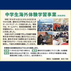 昨日9/20付で教育委員会広報誌「ちょうふの教育」が発行されました。そのなかでは、中学生海外体験学習授業の速報が出ておりました。 多感な時期に海外で学んだ知識や経験はかけがえのないものとなっていることと思います。また、今 […]